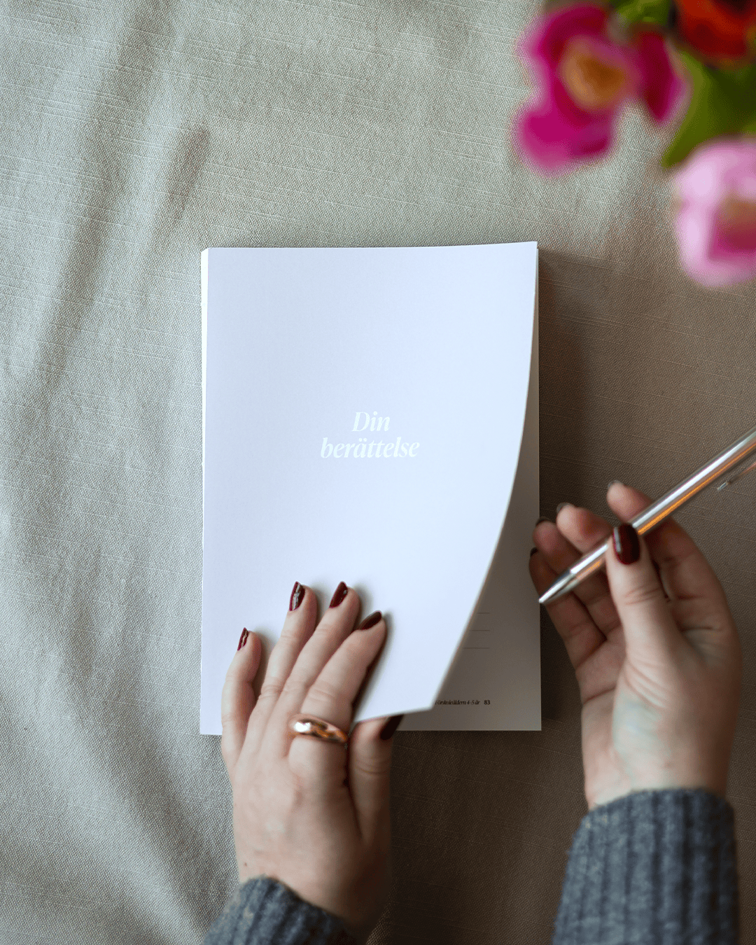 Uttrycket skulle kännas varmt och inspirerande, med fokus på skrivandet och utan känslan av ett formulär. Designen togs fram utifrån en gemensam moodboard där mjuk typografi, lugna färger och ett tidlöst formspråk var vägledande.