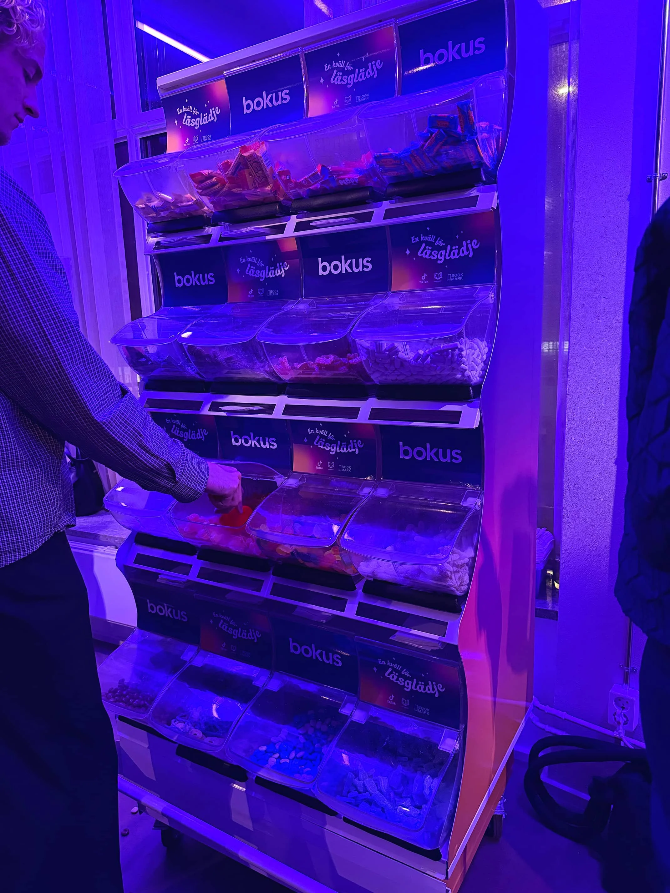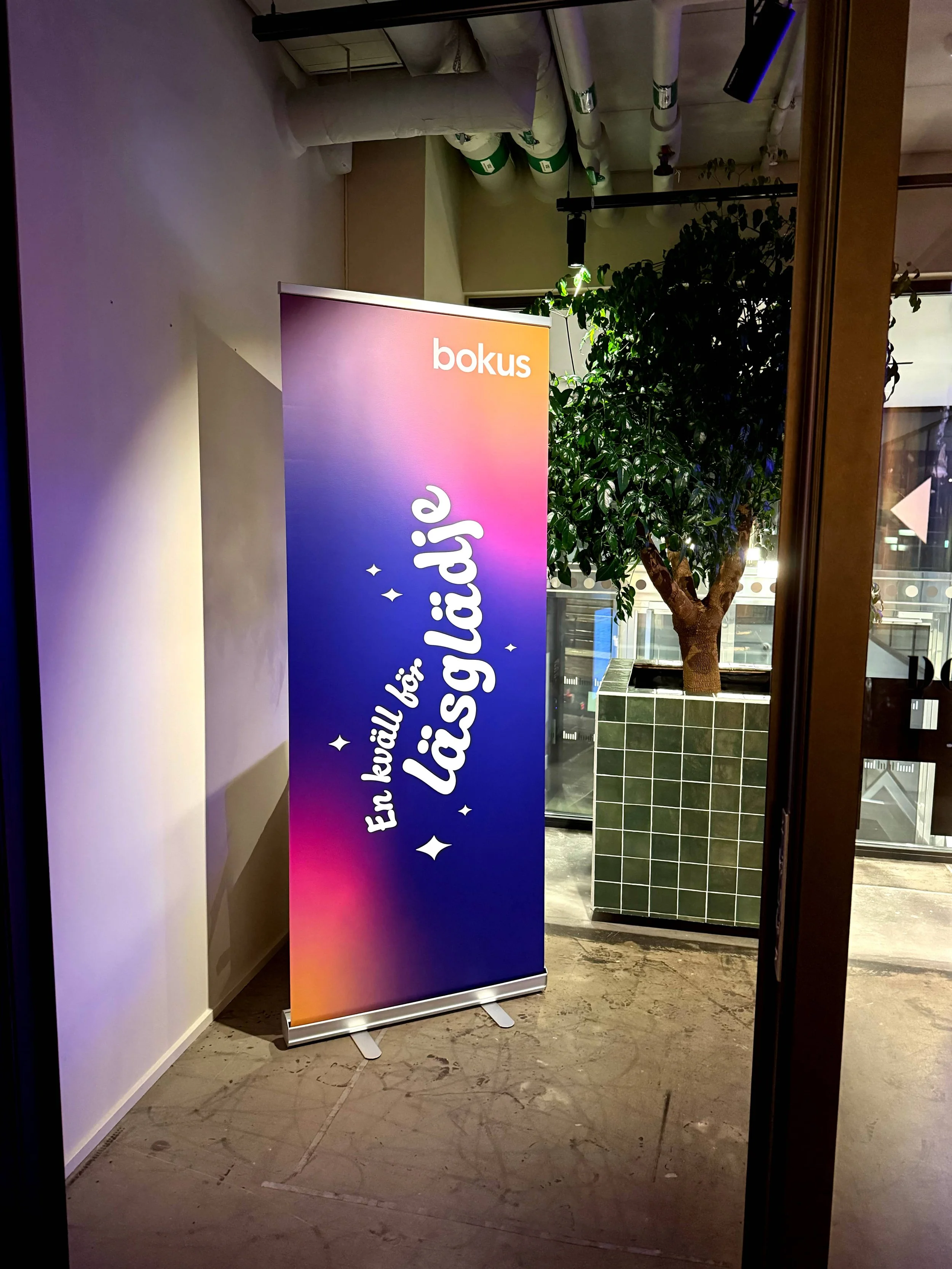 En visuell identitet som förmedlar glädje, värme och festlighet – med en mjuk och inbjudande ton. Det lekfulla formspråket och den runda skrivstilen skapar en personlig känsla som knyter an till läsande och berättande. Den varma färgpaletten, inspirerad av kvällsljus och scenens strålkastare, ger ett glödande intryck där den orange tonen subtilt länkar till Bokus varumärkesfärg.