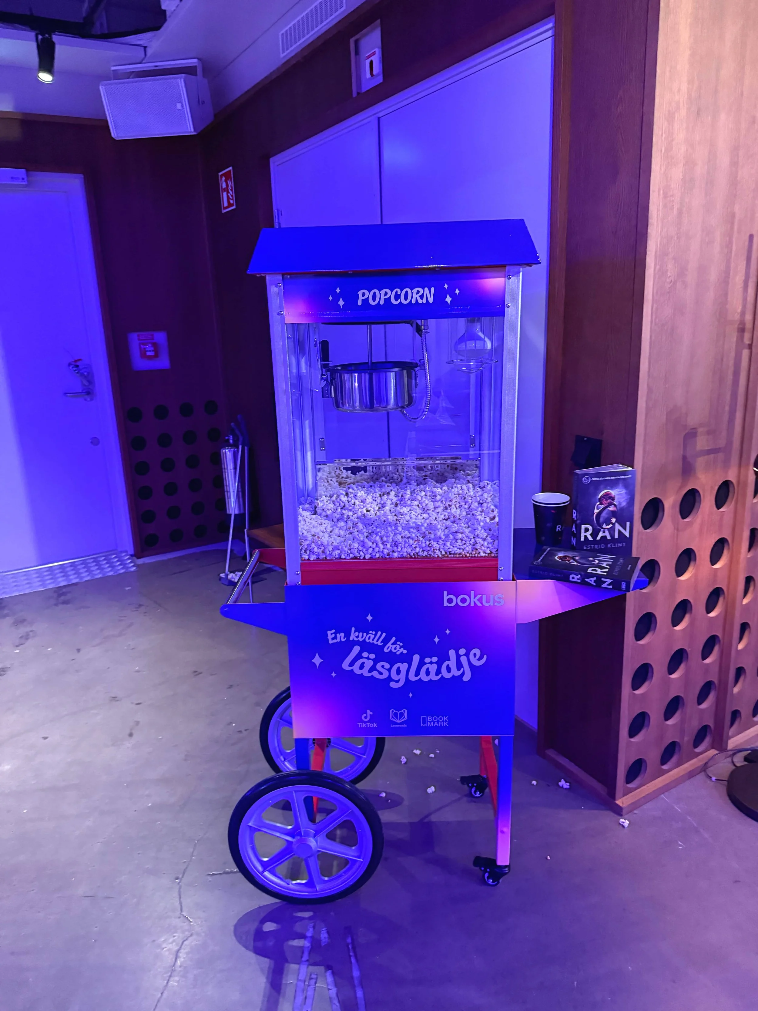 Trycksaker: roll-up, manuskort, fotobås, popcornmaskin, godishyllor och annat till eventet